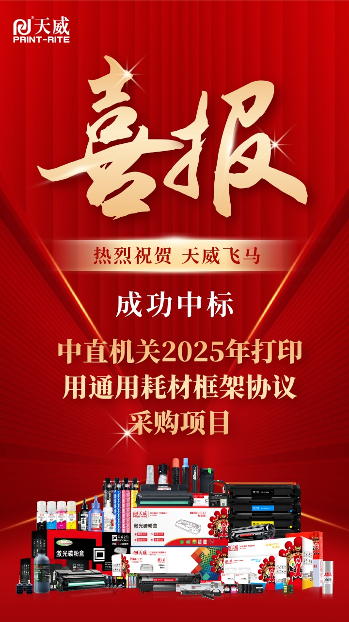 近日,天威凭借卓越的综合实力成功中标《中直机关2025年打印用通用耗材框架协议采购项目》!这不仅是一份荣誉,更是对天威品牌实力与产品质量的高度认可。